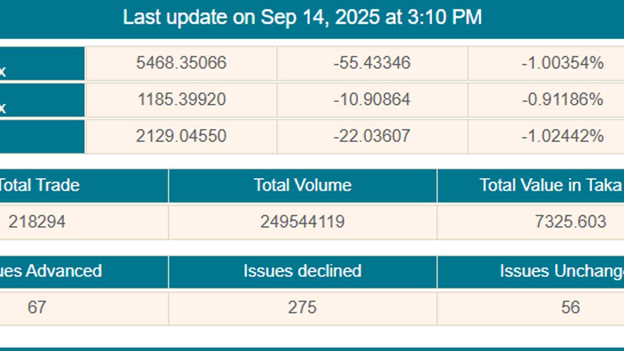 দেশের প্রধান পুঁজিবাজার ঢাকা স্টক এক্সচেঞ্জে (ডিএসই) সপ্তাহের প্রথম কার্যদিবস রোববার (১৪ সেপ্টেম্বর) সবগুলো মূল্য সূচকের বড় পতনে লেনদেন শেষ